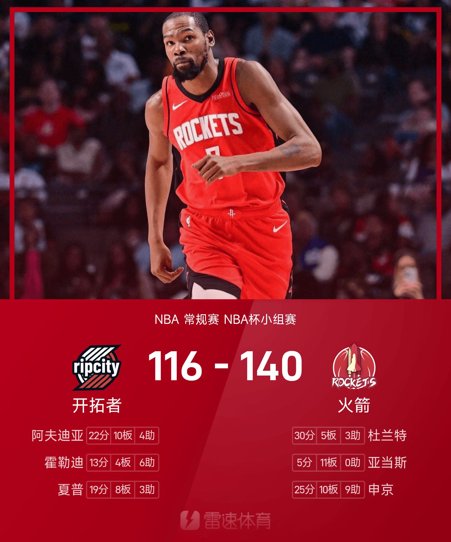 Với giá trị cộng trừ là +37, Durant ghi được 30 điểm, 5 rebound và 3 kiến tạo một cách hiệu quả, giúp Rockets giành chiến thắng dễ dàng trước Trail Blazers.